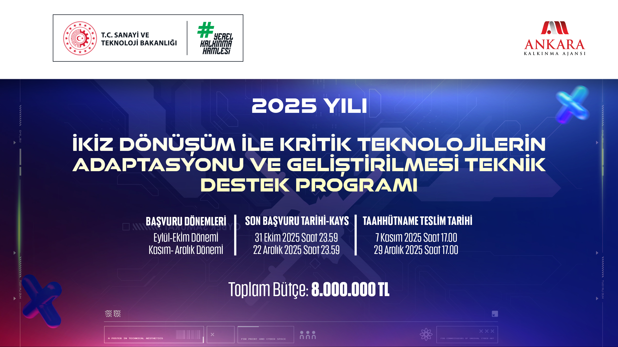 Toplam bütçesi 8.000.000,00 TL olan 2025 Yılı İkiz Dönüşüm İle Kritik Teknolojilerin Adaptasyonu ve Geliştirilmesi Teknik Destek Programı’nın amaçları, öncelikleri, uygunluk kriterleri, başvuru koşulları ve değerlendirme sürecine ilişkin bilgi, bu ilanın sonuna eklenmiş olan Program Başvuru Rehberi’nde yer almaktadır.