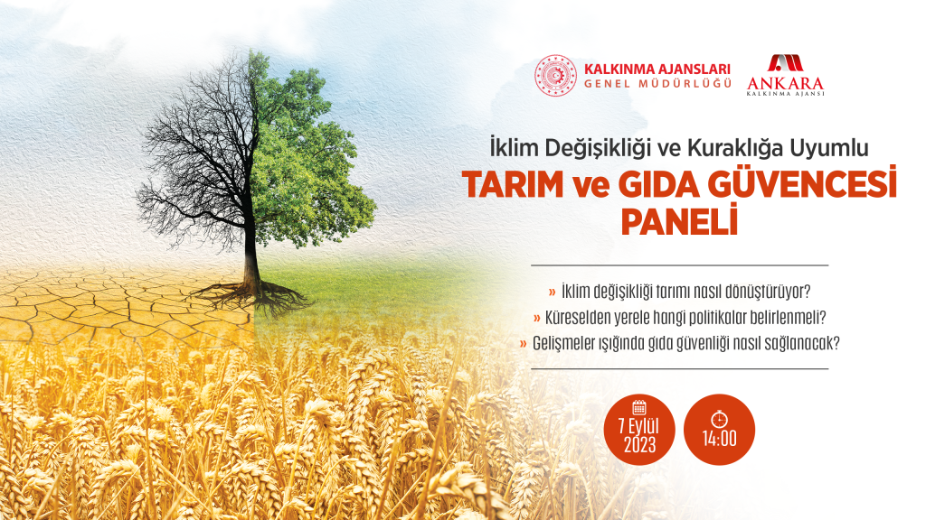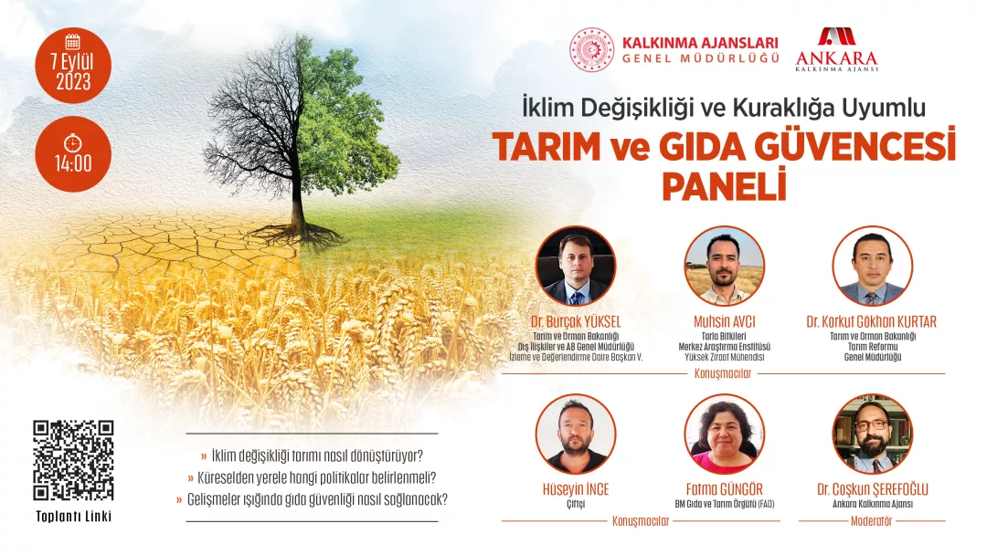 The 'Climate Change and Food Security Panel', in which the effects of climate change on agriculture and food safety, was held in Ankara on September 7, 2023. The event, organized via online, was moderated by Dr. Coskun Serefoglu who works at Ankara Development Agency as an expert. The panelists of the event are Fatma Güngör from the United Nations (UN) Food and Agriculture Organization (FAO), Deputy Head of Monitoring and Evaluation Department of the Ministry of Agriculture and Forestry, Foreign Relations and EU General Directorate, Dr. Burçak Yüksel and General Directorate of Agrarian Reform Dr. Korkut Gökhan Kurtar, Farmer Hüseyin İnce and Agricultural Engineer Muhsin Avcı from the Central Research Institute of Field Crops.