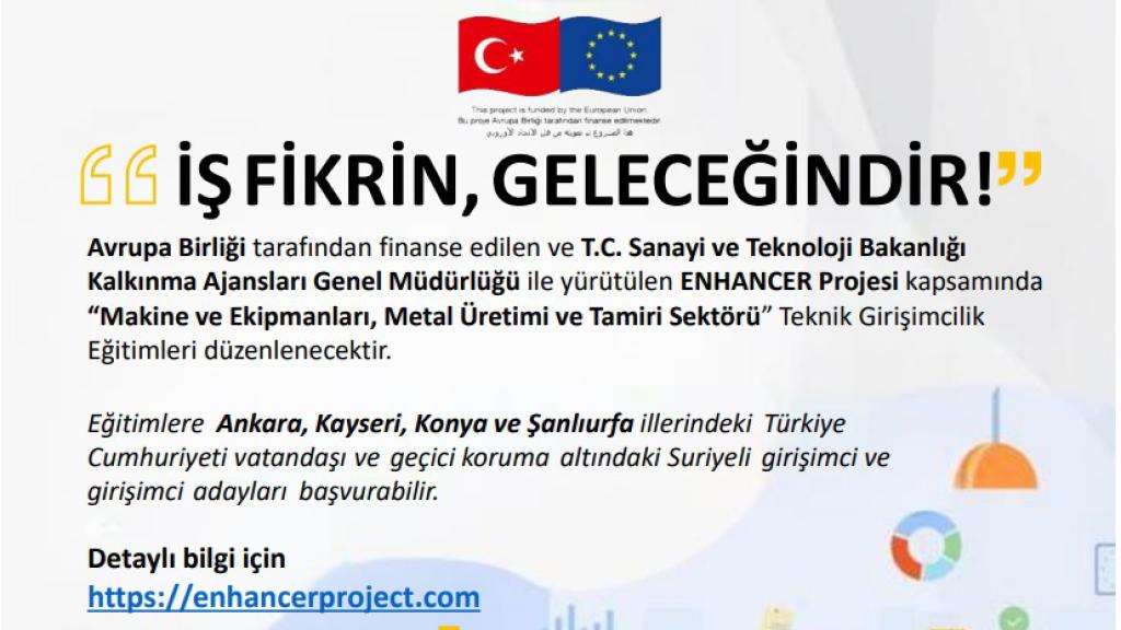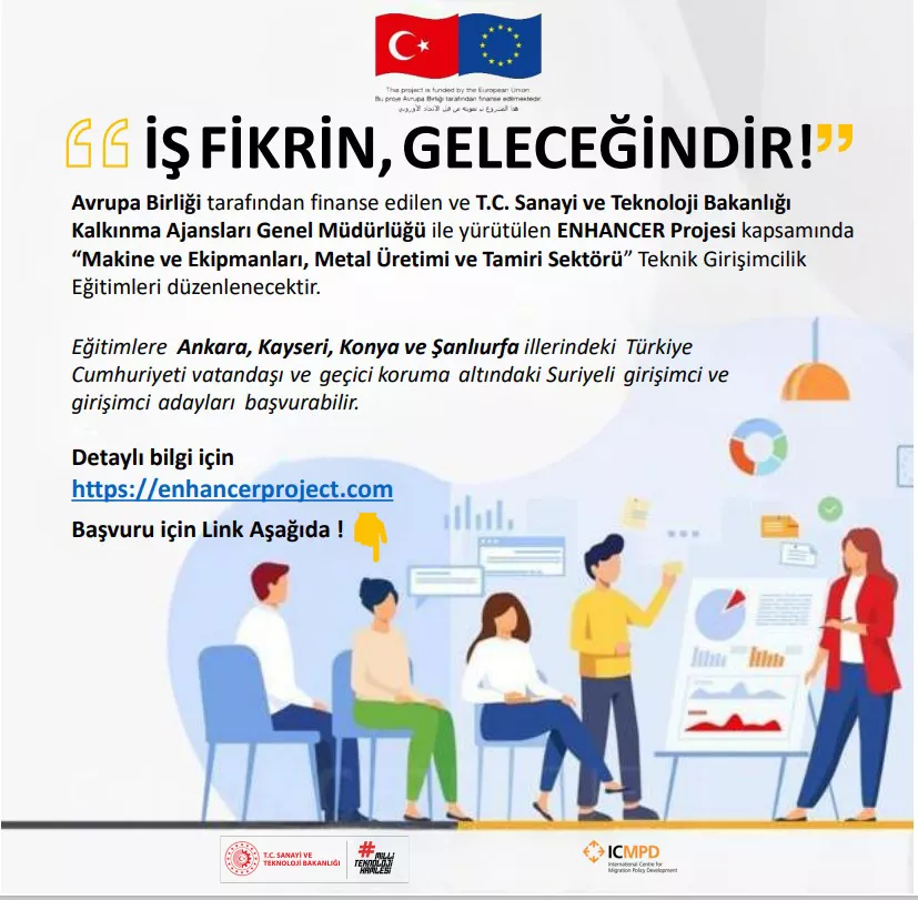 Avrupa Birliği tarafından finanse edilen ve Uluslararası Göç Politikaları Geliştirme Merkezi (ICMPD) tarafından, T.C. Sanayi ve Teknoloji Bakanlığı Kalkınma Ajansları Genel Müdürlüğü koordinasyonuyla yürütülen “Sürdürülebilir Sosyo-Ekonomik Uyum için Girişimcilik Kapasitelerinin İyileştirilmesi (ENHANCER) Projesi” kapsamında ‘’Makine ve Ekipmanları, Metal Üretimi ve Tamiri Sektörü Teknik Girişimcilik Eğitimi” başlayacaktır. Eğitim, Konya, Ankara, Kayseri ve Şanlıurfa illerinde ikamet eden Türk vatandaşları ve geçici koruma altındaki Suriyeli girişimci ve girişimci adaylarına yönelik, 2 Kasım 2023 – 21 Ocak 2024 tarihleri arasında çevrimiçi ve yüz yüze olarak düzenlenecektir.