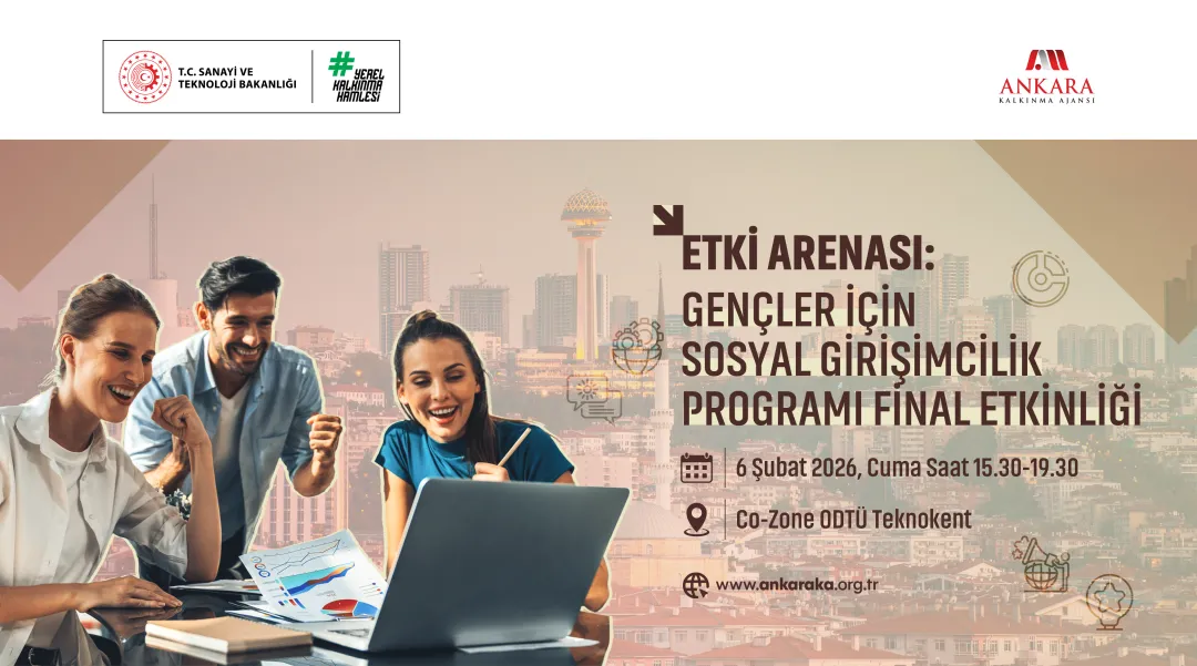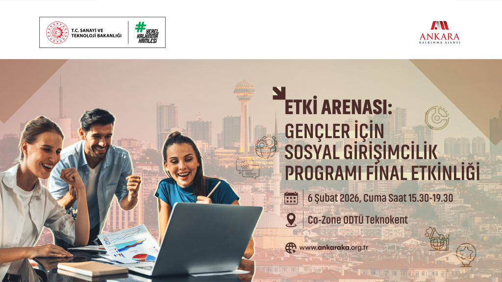 Ankara Kalkınma Ajansı tarafından gençlerin sosyal girişimcilik alanında bilgi ve yetkinlik kazanmalarını desteklemek amacıyla hayata geçirilen “Geleceğe Etki: Gençler için Sosyal Girişimcilik Programı” final etkinliği olan Etki Arenası Yarışması ile tamamlanıyor. Program kapsamında eğitim ve mentorluk süreçlerini başarıyla tamamlayan 8 takım, 6 Şubat 2026 tarihinde geliştirdikleri sosyal girişim fikirlerini jüri karşısında sunacak.