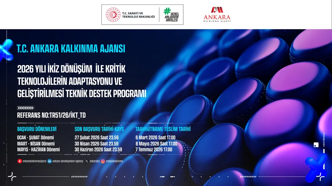 Ankara Kalkınma Ajansı, sanayi ve hizmet sektörlerinde faaliyet gösteren kurum ve kuruluşların dijital ve yeşil dönüşüm kapasitelerinin artırılması; kritik teknoloji alanlarında farkındalık, yetkinlik ve uygulama düzeylerinin geliştirilmesi yoluyla ikiz dönüşüm süreçlerinin hızlandırılması amacıyla 2026 Yılı İkiz Dönüşüm İle Kritik Teknolojilerin Adaptasyonu ve Geliştirilmesi Teknik Destek Programı’nı açıkladı.