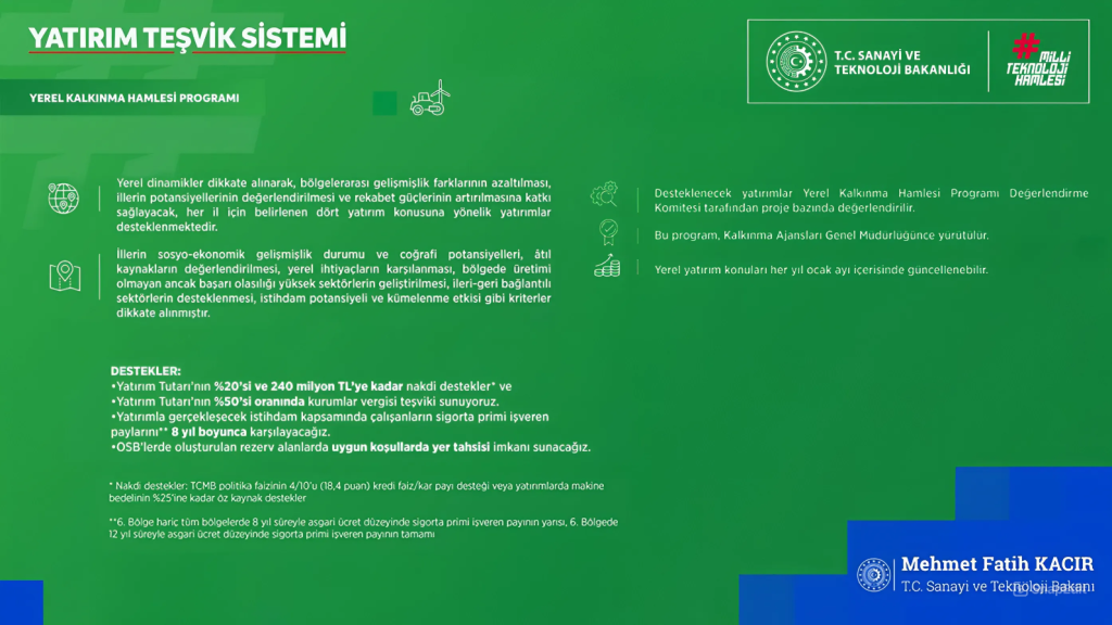 Yeni sistemde, Teknolojik Hamle Programı, Yerel Kalkınma Hamlesi ve Stratejik Hamle Programı kapsamında özel destekler sunulacak. Teknolojik Hamle kapsamında yüksek katma değerli yatırımlara, Yerel Kalkınma Hamlesi’yle her şehre özgü 4 yatırım konusuna ve Stratejik Hamle ile belirlenen dış ticaret dengesini iyileştirici yatırımlar ile “dijital ve yeşil dönüşüm” yatırımlarına ayrıştırıcı teşvikler sunulması planlanıyor. Öz kaynakla yapılacak makine alımlarında; makine bedelinin %25’ine, yatırım tutarının %15’ine ve 240 milyon TL’ye kadar nakdi destek sağlanması öngörülüyor.