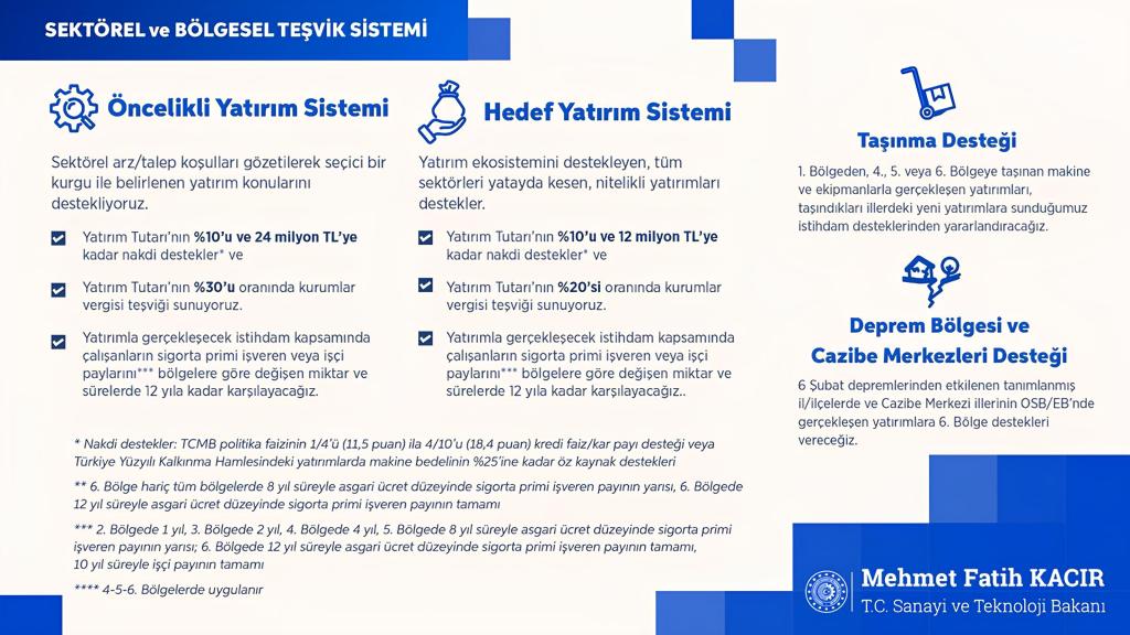 Cumhurbaşkanı Kararı ile Resmî Gazete’de yayımlanarak yürürlüğe giren Yeni Yatırım Teşvik Sistemi, yatırım ortamını iyileştirmek ve Türkiye Yüzyılı hedefleri doğrultusunda nitelikli yatırımları hızlandırmak amacıyla yeniden yapılandırıldı. Sistem, yatırımcılara daha seçici, odaklı ve bölgesel farklılıkları gözeten destek mekanizmaları sunuyor.